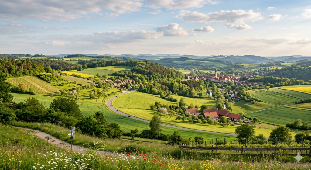 Deine Reise beginnt in Berlin, wo du die flache norddeutsche Tiefebene hinter dir lässt und auf der A9 gen Süden steuerst. Anfangs dominieren die weiten Kiefernwälder Brandenburgs und die geraden Streckenabschnitte Sachsen-Anhalts das Bild, doch schon bald verändert sich die Kulisse merklich. Sobald du Thüringen erreichst, wird die Landschaft dynamischer; das Gelände beginnt zu „atmen“ und die Autobahn schlängelt sich durch das mitteldeutsche Hügelland, vorbei an den ersten Weinbergen der Saale-Unstrut-Region und geschichtsträchtigen Burgen, die stolz auf den Felsen thronen. Nach der Überquerung der Landesgrenze zu Bayern tauchst du in die dichten, tiefgrünen Ausläufer des Frankenwaldes ein. Die Täler werden enger und waldreicher, bis du schließlich dein erstes Etappenziel Bamberg erreichst, wo dich die historische Altstadt inmitten einer sanften, flussreichen Hügellandschaft empfängt.