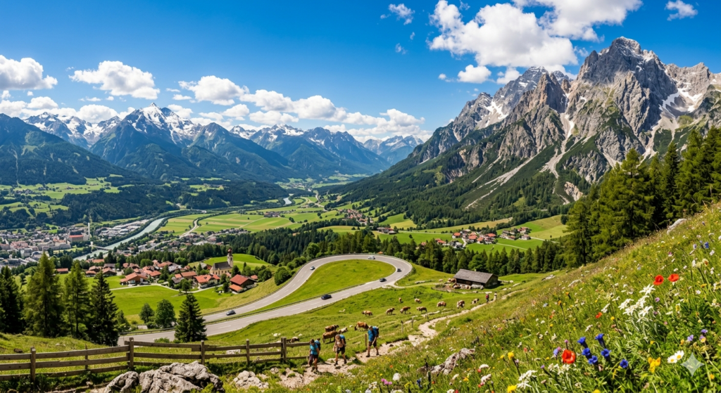Am zweiten Tag setzt du deine Fahrt fort und durchquerst zunächst die Fränkische Alb, deren markante Felsformationen immer wieder am Horizont auftauchen. Weiter südlich fährst du durch die Hallertau, das größte Hopfenanbaugebiet der Welt, wo endlose Reihen von Hopfengärten die sanften Wellen der Landschaft prägen. Nach der Passage von München folgt einer der beeindruckendsten Momente der Reise: Die flache oberbayerische Ebene weicht plötzlich der gewaltigen Kulisse der Alpen, die wie eine massive Mauer vor dir aufsteigen. Die Fahrt führt dich nun direkt in die Berge hinein, vorbei an den klaren Voralpenseen, bis du die österreichische Grenze passierst. Du folgst dem breiten Inntal, flankiert von den steilen, oft schneebedeckten Felswänden des Karwendelgebirges, und erreichst schließlich das alpin-urbane Innsbruck, das eingebettet zwischen riesigen Gipfeln im Tal liegt.