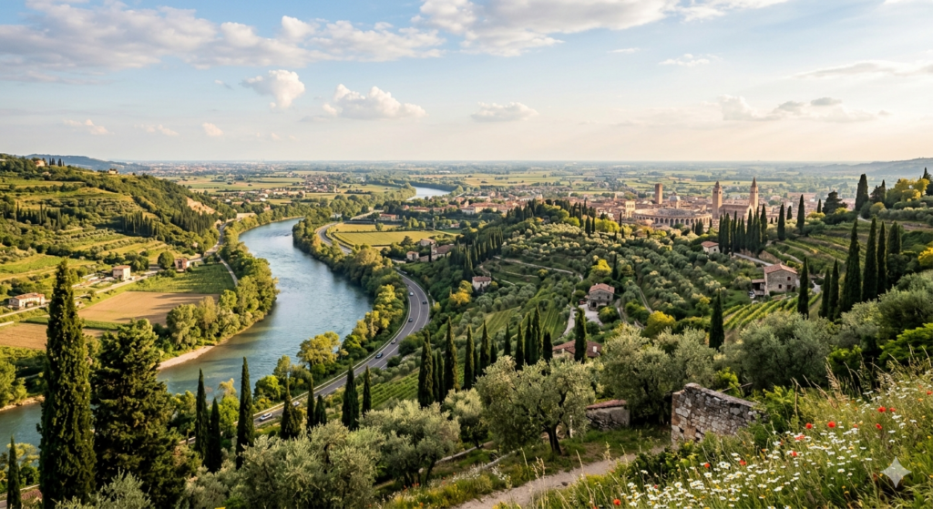 Die letzte große Etappe führt dich von Innsbruck hinauf zum Brennerpass, dem „Dach“ deiner Route. Auf spektakulären Brückenkonstruktionen wie der Europabrücke überquerst du den Alpenhauptkamm und genießt dabei den Blick auf Almwiesen und Hochgebirgsgletscher. Mit der Abfahrt auf der italienischen Seite verändert sich die Welt fast schlagartig: Die schroffen Felsen Südtirols weichen terrassierten Weinhängen und riesigen Apfelplantagen, während die Architektur der Dörfer zunehmend mediterraner wird. Du folgst dem Verlauf der Etsch flussabwärts, wo zusehends Zypressen und Olivenbäume das Bild prägen, bis sich das Tal bei Verona in die weite Po-Ebene öffnet. Der letzte Abschnitt nach Mailand führt dich durch das landwirtschaftliche Herz der Lombardei; eine weite, friedliche Ebene mit Pappelalleen und Reisfeldern, während zur Rechten die fernen Alpen als silbriges Band am Horizont mitlaufen, bis die markante Skyline von Mailand die Ankunft in der Metropole ankündigt.